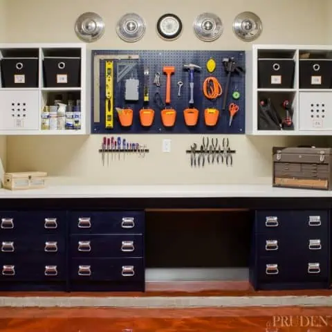 It has a pegboard tool rack for easy access to hand tools, open wall shelves, and drawer storage for smaller items.